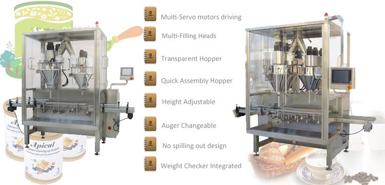 These series machines are applicable for packing powder, small granule in form of bottle, can, or jar, Dual filling auger , enable high speed and high filling accuracy , with different type of capping or sealing device is capable to form a production line