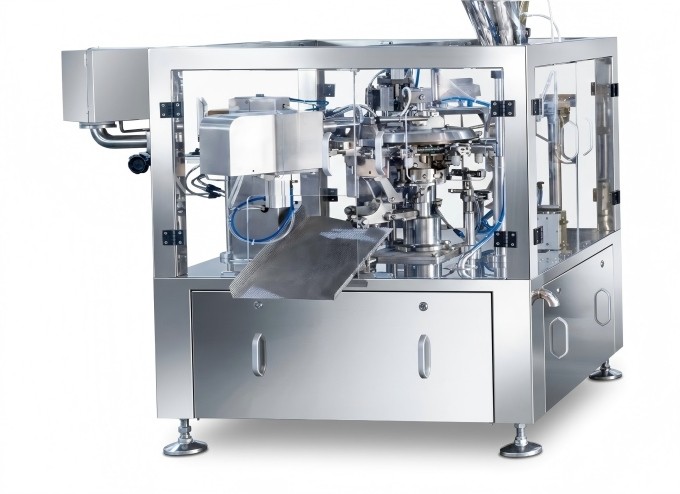 This rotary premade pouch packaging machine features a 6-station design engineered for complex packaging processes. Its standard configuration supports flat pouches, with options for stand-up pouches and zipper bags