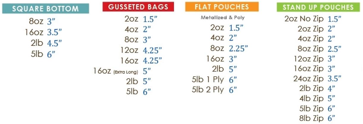 | Capacity | Weight (g) | Square Bottom Gusset Bag Size | Gusset bag Size | Flat pouch Size | Stand up Pouch Size |